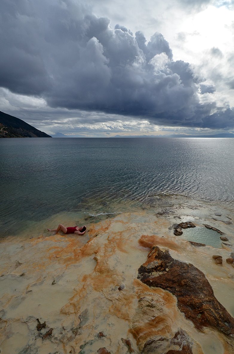The lake is sheltered by a cliff that catches the sun, and has a small beach at one edge, There is a narrow wooden deck running all along one long side, across from the cliff. It's just wide enough for a chaise lounge and a little room to walk by. Then it's just big enough for a chair. These are the best spots- get out the stack of magazines you have brought, read, nap, watch the light change over the cliff face. Time to go in? The steam rising off the surface really only means that the water is warmer than the air. It doesn't mean it is warm. What you do is you go in, then get out and feel how much cooler the air actually is, especially when you're undressed and wet, wait a minute and get good and cold, then plunge back in. Not too bad now. Keep moving, slowly. Were you spoiled by the salty thick waters of the Aegean all summer, where you can keep yourself afloat paddling gently with one hand while you hold a gin tonic in the other? (not every time- I had my godmother visiting). You will sink like a stone in this lake if you don't swim like you mean it.